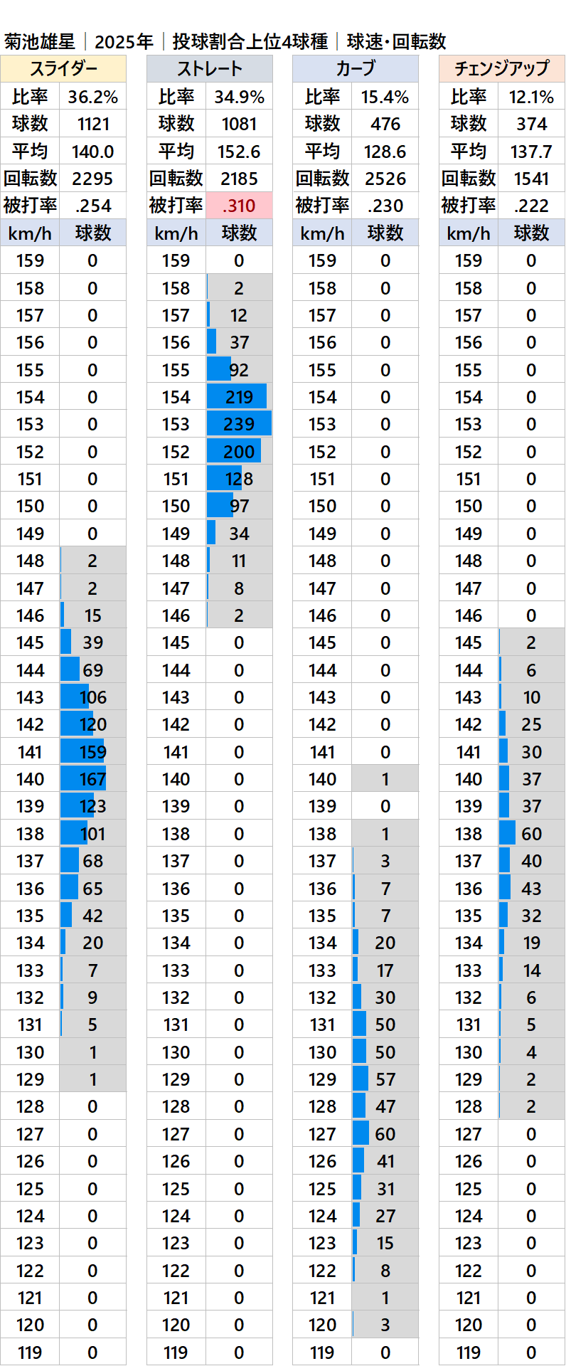 エンゼルスの菊池雄星投手の2025年シーズンの球種別の投球割合・球速・回転数・被打率の情報です。