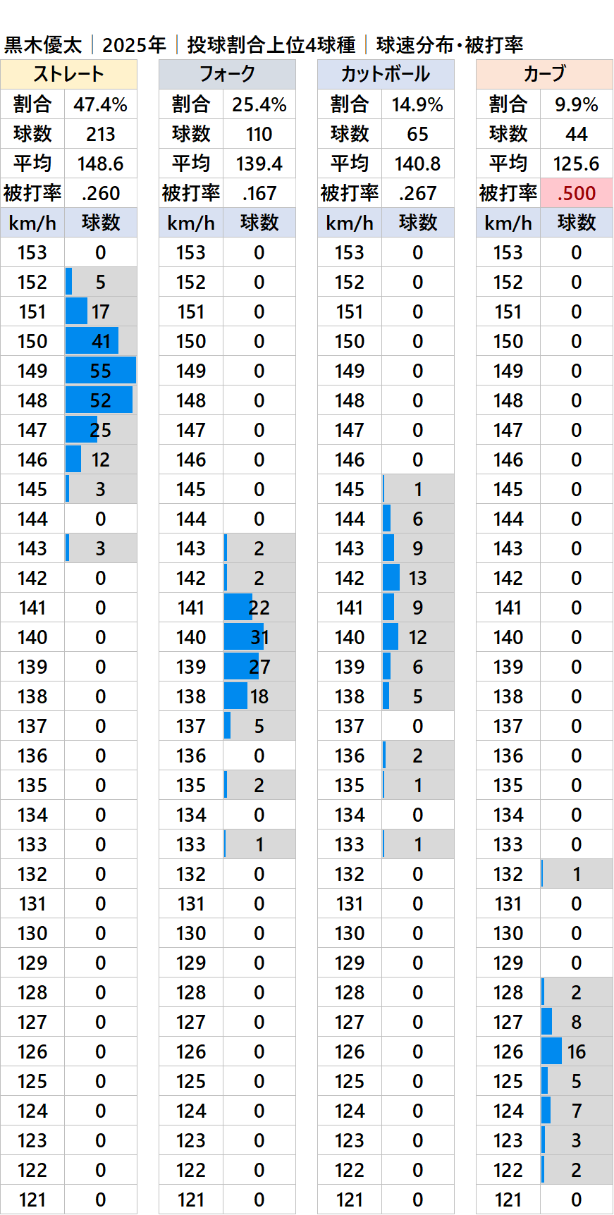 球種別球速・投球比率・被打率