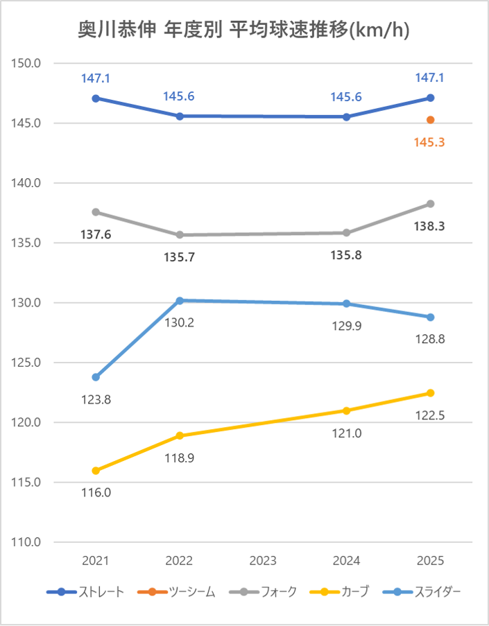 ストレートの平均球速は2024年と比較して約1.5km/h上昇。