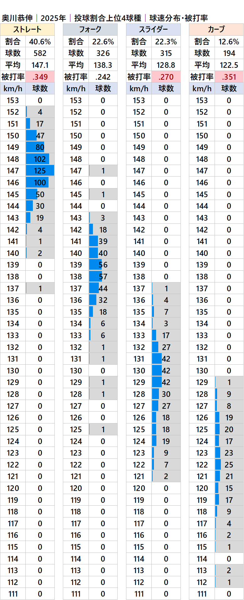 ヤクルトの奥川恭伸投手(右投)の2025年シーズンの球種別の投球割合・球速・被打率の情報です。