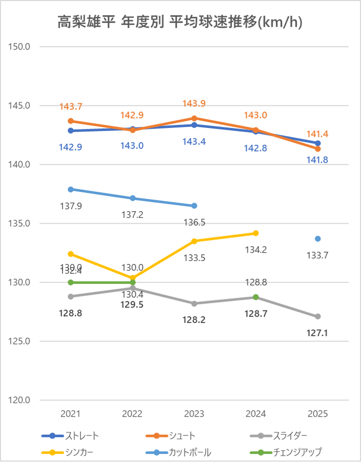 ストレートの平均球速は2024年と比較して1km/h低下。