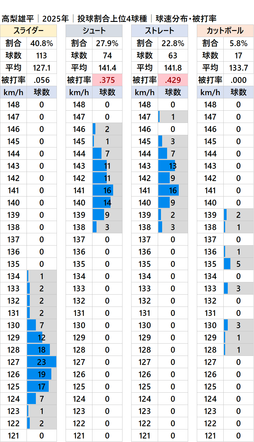 球種別球速・投球割合・被打率