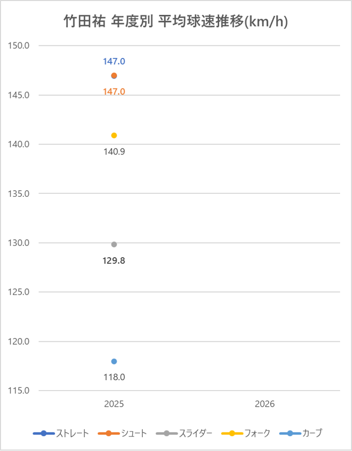 DeNAの竹田祐投手の2025年シーズンの球種別の投球割合・球速・被打率の情報です。