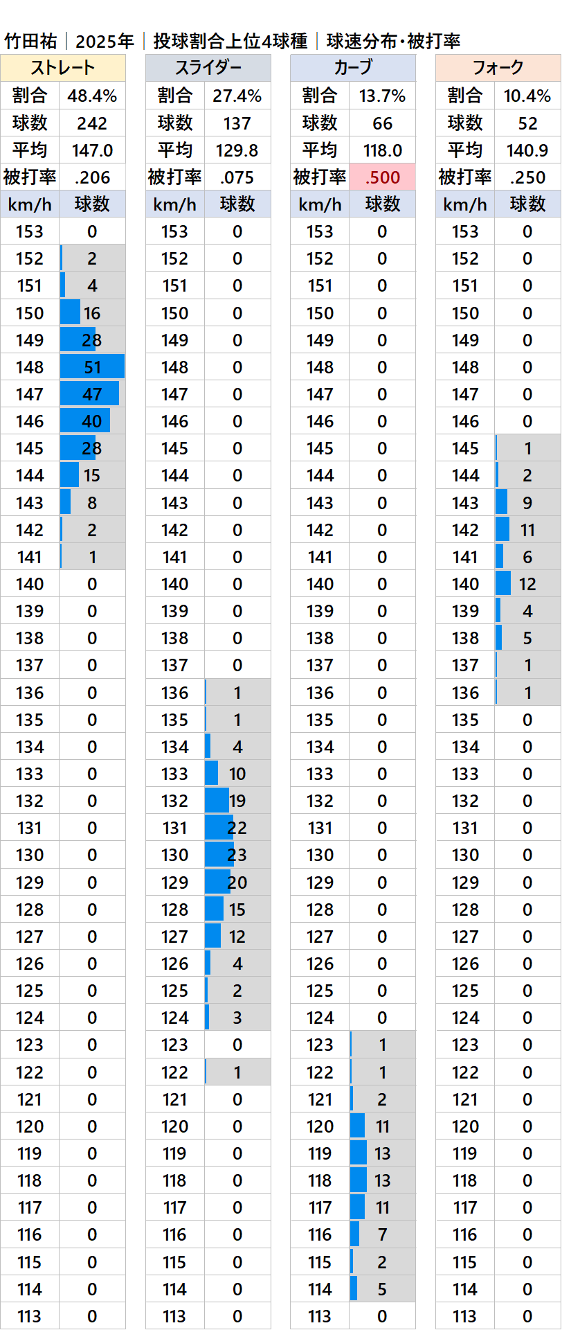 球種別球速・投球割合・被打率
