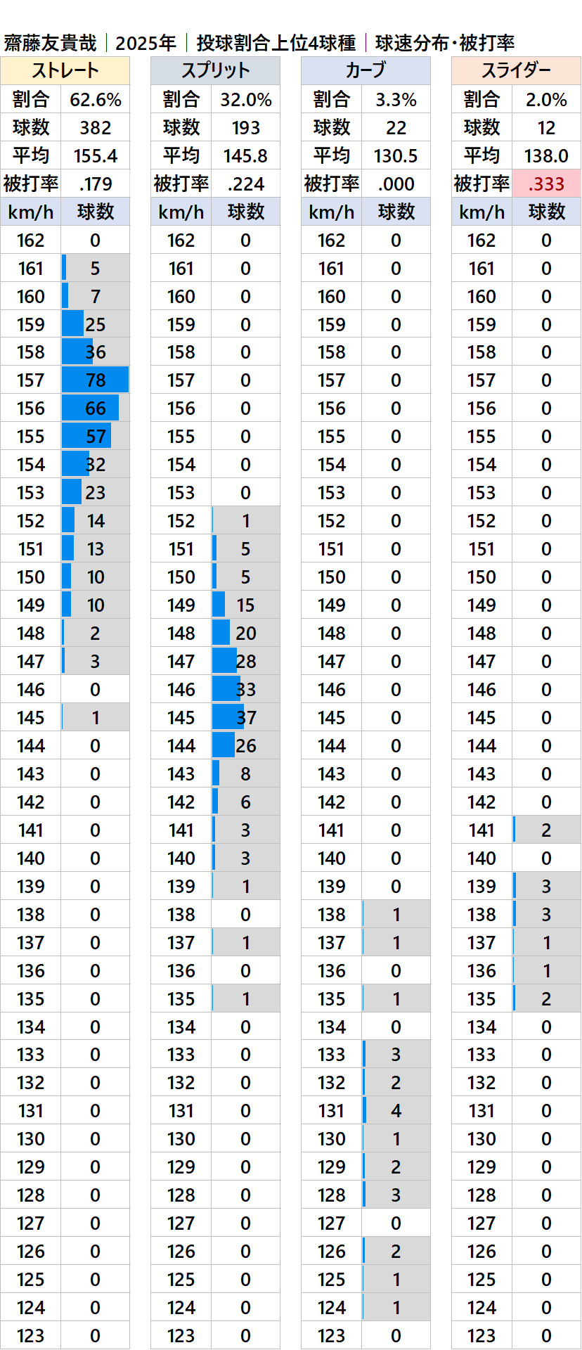 日本ハムの斉藤友貴哉投手の2025年シーズンの球種別の投球割合・球速・被打率の情報です。