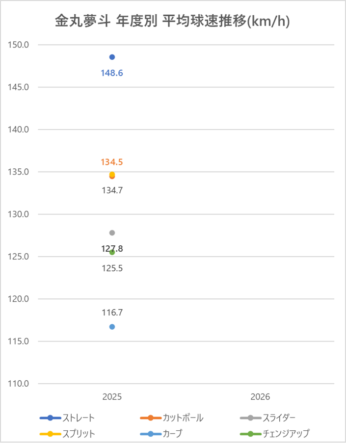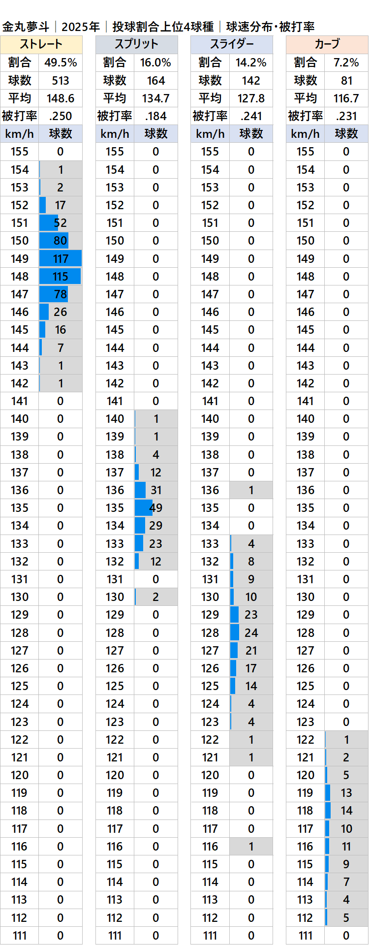 中日の金丸夢斗投手の2025年シーズンの球種別の投球割合・球速・被打率の情報です。
