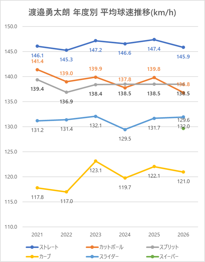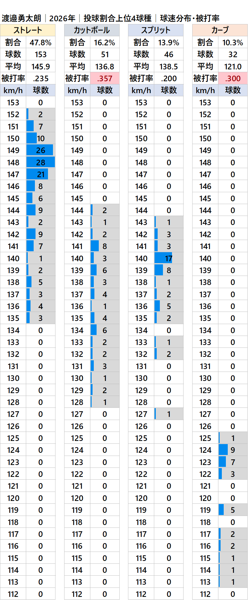 西武の渡邉勇太朗投手(右投)の2026年シーズンの球種別の投球割合・球速・被打率の情報です。