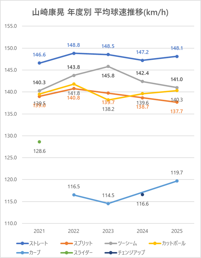 ストレートの平均球速は2024年と比較し0.9km/h上昇。