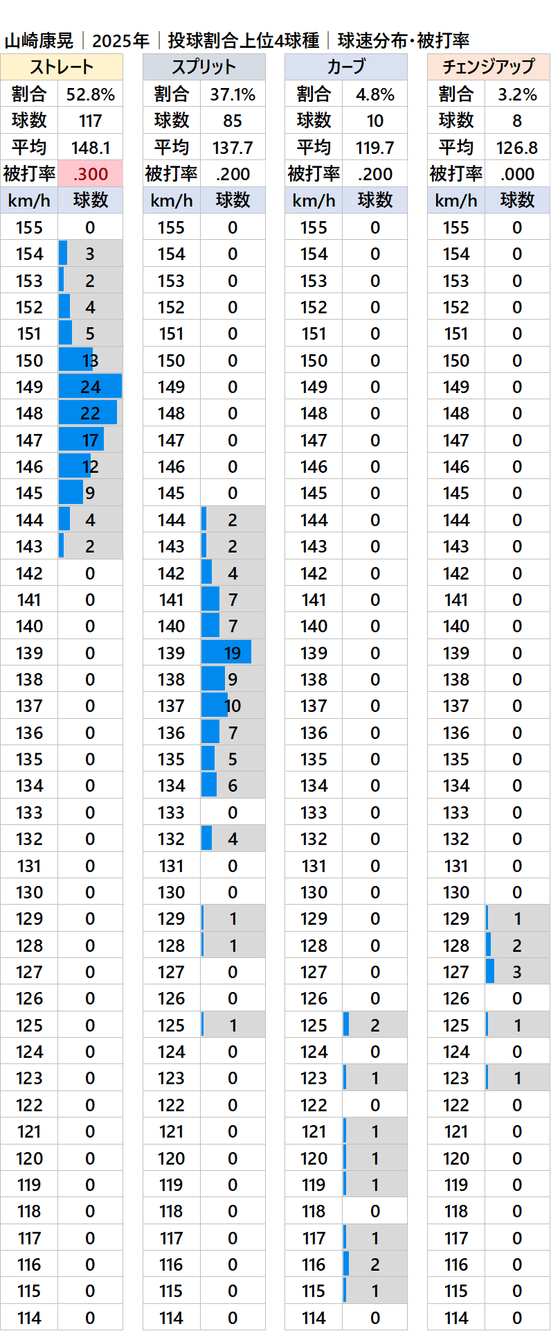 DeNAの山崎康晃投手の2025年シーズンの球種別の投球割合・球速・被打率の情報です。